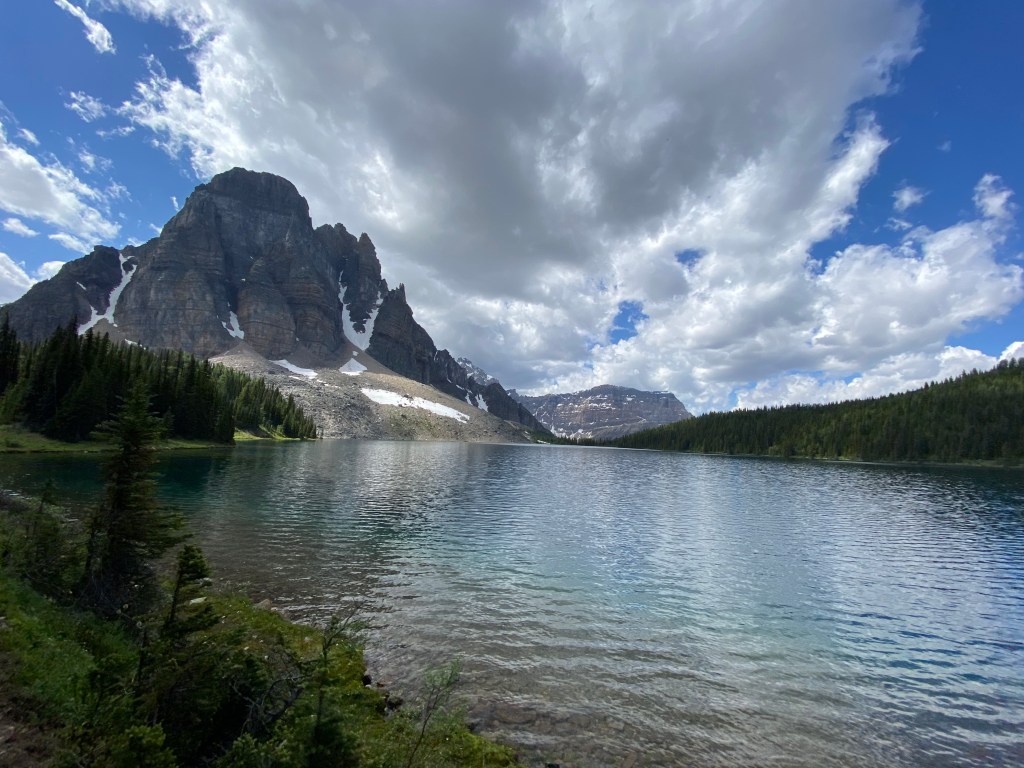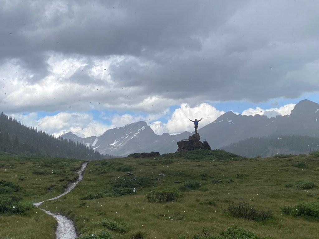 We persevered through the hail and by the time we reached Lake Og the skies were clear and we were once again dry. Lake Og also offers a campsite for hikers, although it is not quite as large or as nice as the one at Lake Magog. After enjoying about 30 minutes of sunshine at the lake, the weather began to change again. Before we knew it we were hiking back through torrential hail and boot deep water. I’d heard that the weather in the Rockies can change quickly, but nothing can really prepare you for what that actually looks like! Within a span of about 30 minuets we experienced sunshine, rain, hail and thunder. Thankfully, by the time we returned to camp the sky was once again clear and within a matter of hours all of our gear was dry.